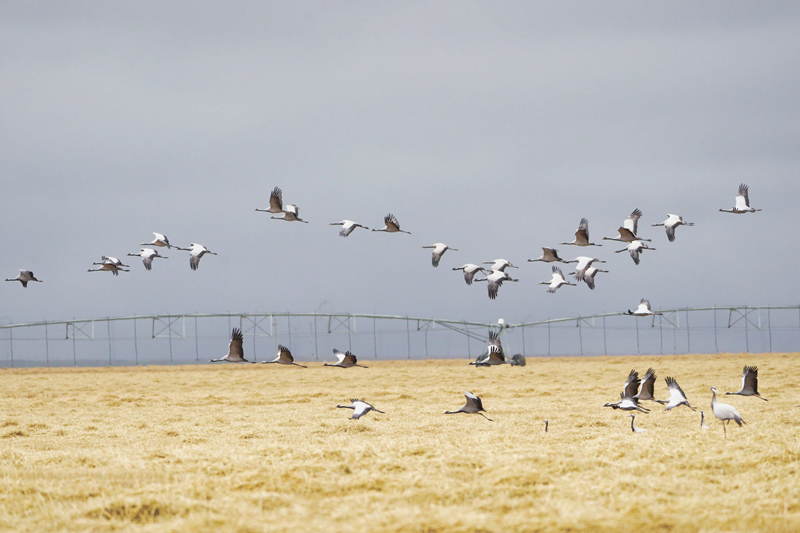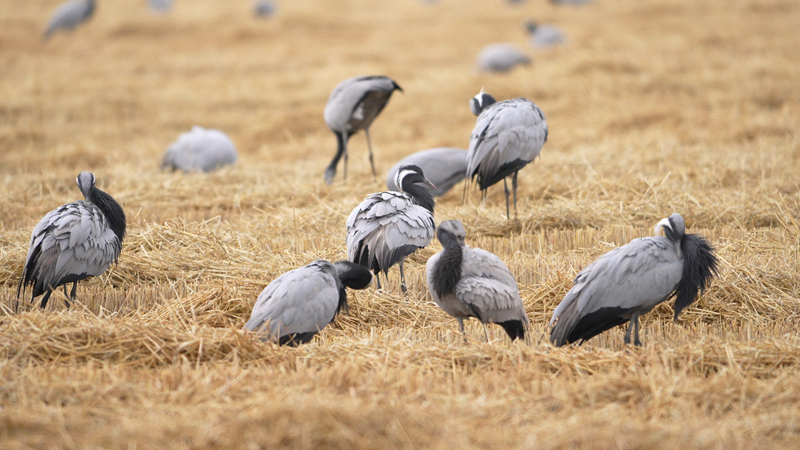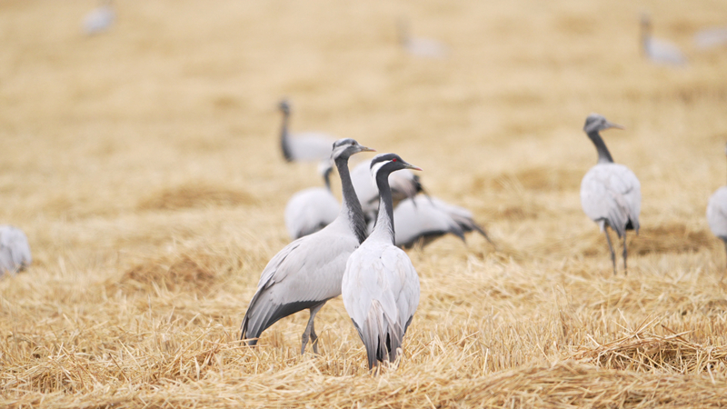 蓑羽鹤俗称“闺秀鹤”,体高约90厘米,灰蓝羽毛配以细长尾羽,颈后垂缀黑色饰羽如蓑衣,是鹤类中体型最小的成员。它们多栖息于开阔湿地,以禾本科植物、昆虫为食,属国家二级保护野生动物。作为迁徙性鸟类,蓑羽鹤常在秋季集群南迁,栖地高度最高可达5000米左右的高原地区。