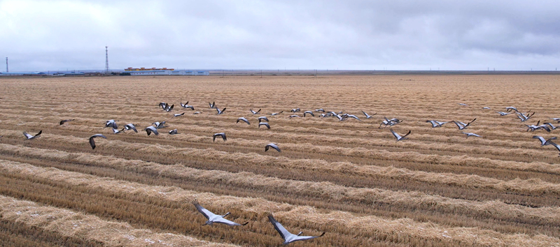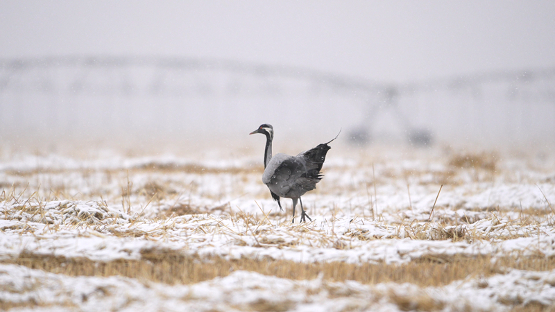近日,祁连山北麓的山丹马场迎来今秋首场小雪,上百只蓑羽鹤在农田中啄食青稞越冬,呈现出一幅自然和谐的图景。